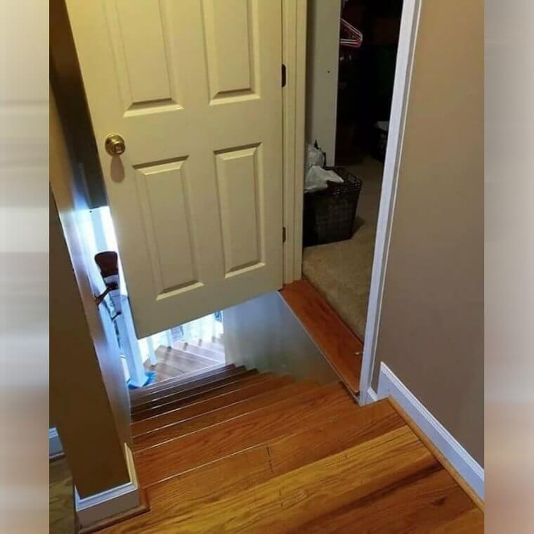 This particular case takes “watch your step” to a whole new level. Can you imagine stumbling into this after a long, exhausting day? Let’s hope this isn’t someone’s bedroom, especially if they work late nights and come home drained. Poor design choices like this not only look strange but can also pose safety risks. It’s a reminder of why investing in professional planning is worth every penny. After all, who wants to deal with a door that’s more of a climbing challenge than an entryway?