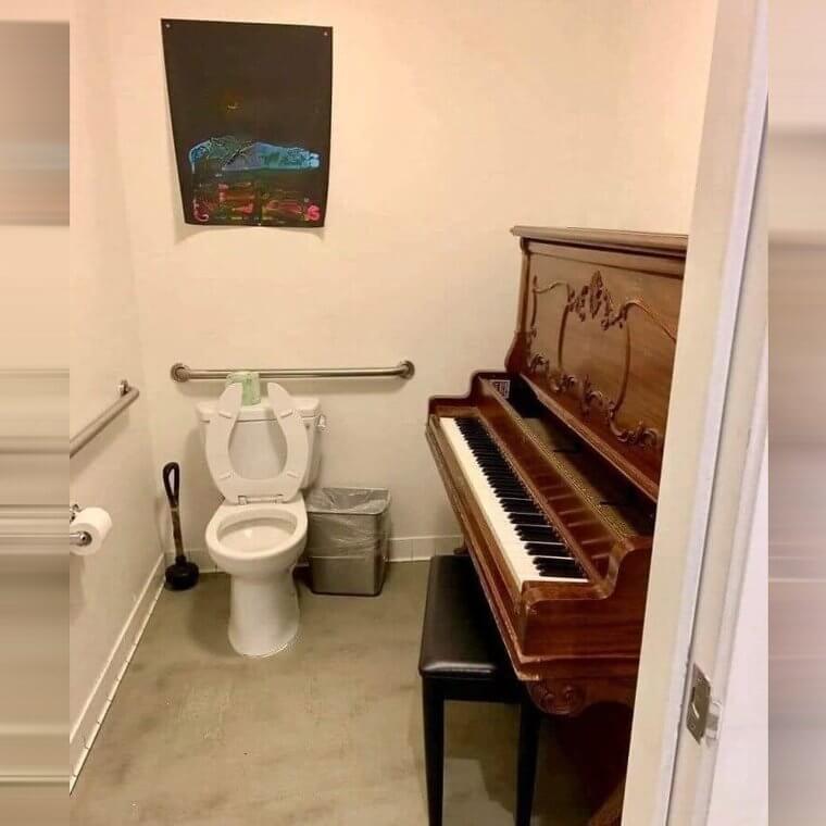 How does a piano enhance accessibility for someone with mobility challenges? Instead, it creates an unnecessary obstacle, making it harder for disabled individuals to navigate the space. Perhaps the piano is a temporary fixture, but its presence highlights a missed opportunity to focus on true accessibility. Could this space be better utilized to support inclusivity? While the idea of a musician providing company might seem whimsical, it doesn’t address the core issue. Let’s hope this piano is removed soon, allowing the bathroom to serve its intended purpose—supporting everyone’s needs equally. After all, shouldn’t accessibility always come first?