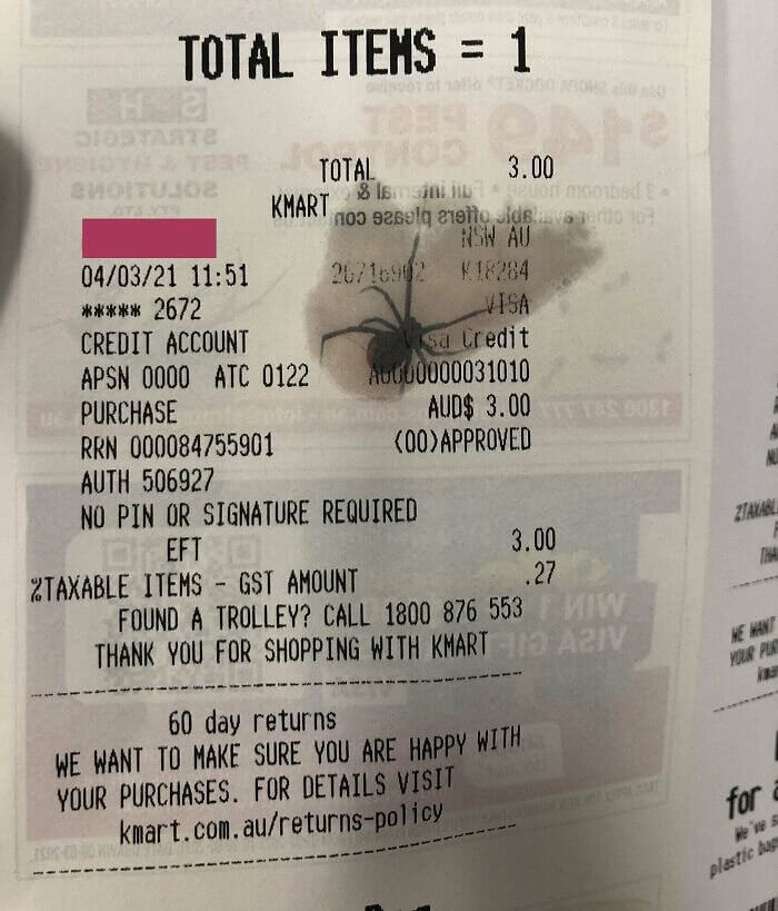 A customer accidentally smudged KFC grease onto their paper receipt, which then revealed what seemed to be a real-life redback spider. It was actually from an advertisement on the other side, thankfully. This person said that their heart felt like it missed a beat when they pulled this thing out from inside of their wallet. It's not hard to imagine the initial panic that anyone would feel when seeing this.