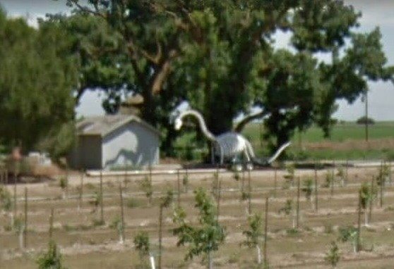 This extraordinary sight might have made the Google Streetview Van Driver perform a double-take, probably giving them whiplash! If you mosey on down to this field in the Californian town of Dixon, near Sacramento, you’ll find this giant dinosaur fossil chomping down its own weight in vine leaves. It’s been a while since we studied dinosaurs at school, but we think it could be a brontosaurus or maybe a diplodocus.