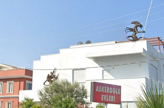 If you think giant Pink Bunny Rabbits are scary, wait til you get a load of this! If you're ever in Kusadasi on Turkey's stunning Aegean coast, watch your six as aliens stalk their prey from the town's rooftops. And not just any old extraterrestrials, but H.R. Giger's terrifying, hellish xenomorphs from the Alien film franchise. Zoom in, and you'll see there's also one clambering up the side of the house!