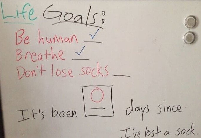 While you might think when you first read this sign that this person set some pretty low life goals for themselves, it seems like they are struggling to even keep those. The goals consist of "be human, breathe, and don't lose socks." While the first two he cannot stop doing if he is alive, the last one is the only real goal. And from the looks of it, he is losing socks just about every day.