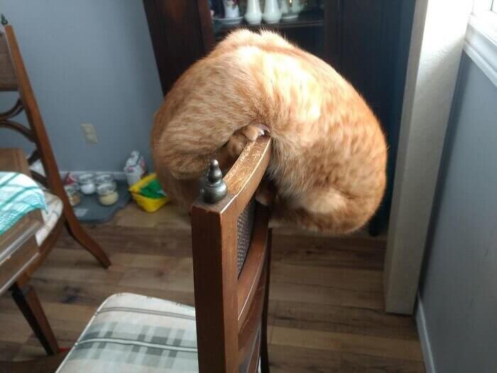This list has certainly been filled with its fair share of cats falling asleep and getting comfortable in weird positions, however, this one takes the cake. This cat is not even able to relax in this position. He is essentially suspended from the chair. How is he able to fall asleep when he is also required to hold on for dear life? It seems like a strange choice.