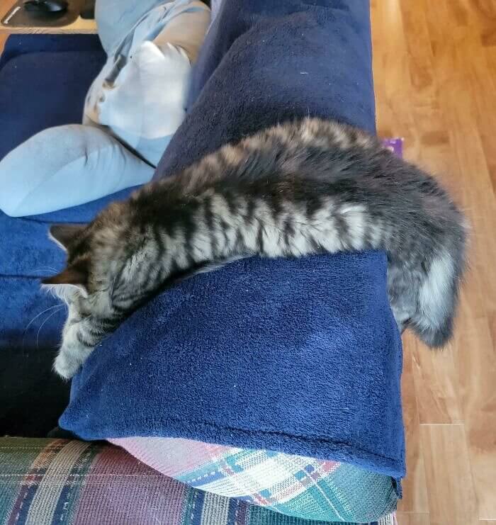 Have you ever seen a deflated cat? The answer to that is probably no unless it was a blow up cat, which hardly exists. However, as has already been previously discussed, some cats have the ability to become liquid at certain times and it looks like this cat is one of them. He has deflated and become a liquid at the same time, laying himself flat over the sofa.